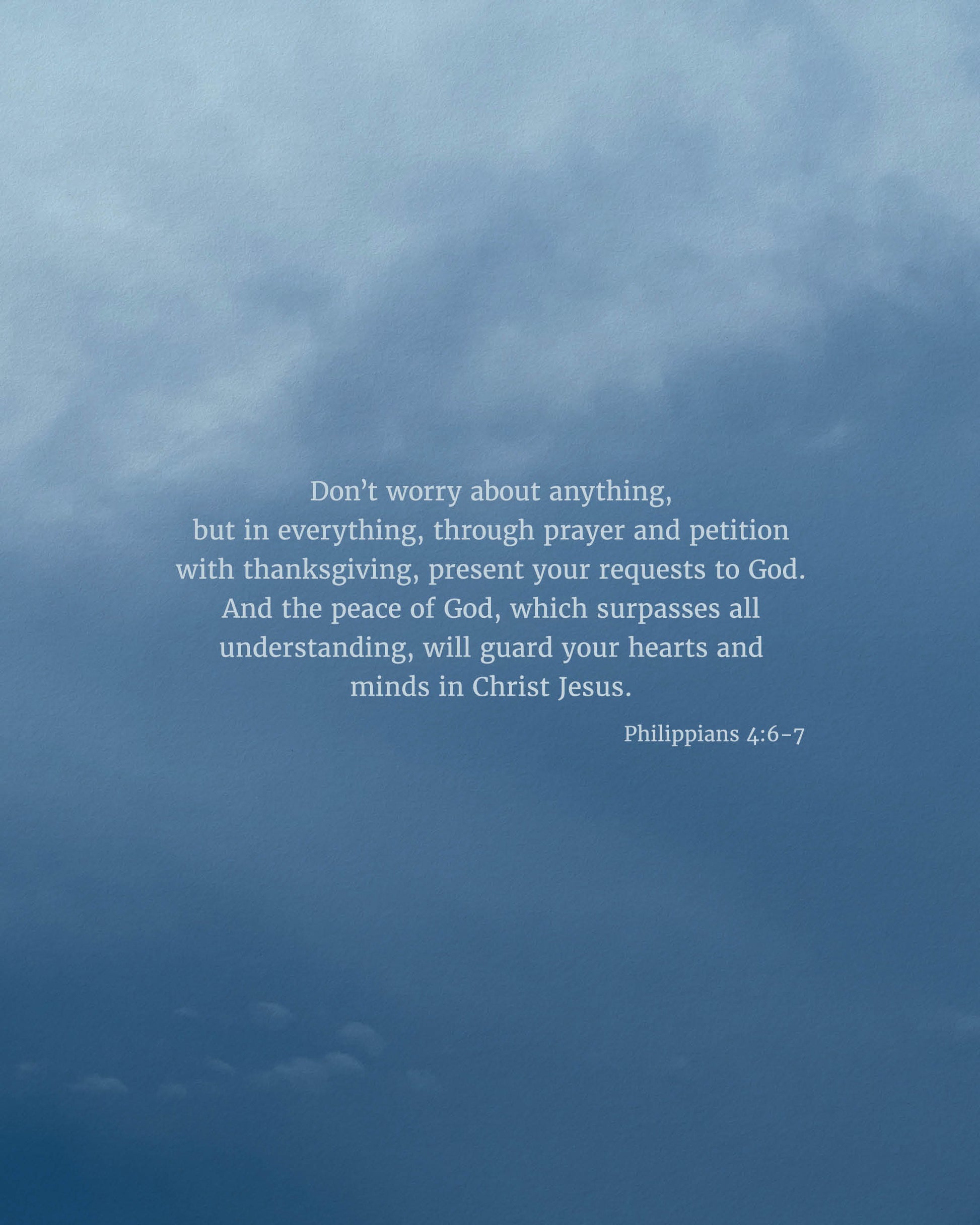 Don’t worry about anything, but in everything, through prayer and petition with thanksgiving, present your requests to God. And the peace of God, which surpasses all understanding, will guard your hearts and minds in Christ Jesus. Philippians 4:6-7